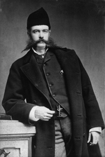 Description :HOMME AUX LARGES FAVORIS, PORTANT PALETOT ET TOQUE APPUYE SUR UN PETIT MEUBLE. PHOTO DE STUDIO.