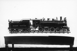 Description :SUR UNE TABLE, UNE LOCOMOTIVE MINIATURE ET POSEE.