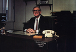 Description :M. COUTURE PREND LA POSE, ASSIS DEVANT SON PUPITRE OU EST AFFICHE: GILLES COUTURE, ADMINISTRATION GENERALE.