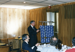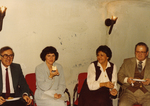 Description :DANS LE LOCAL DES FONCTIONNAIRES MUNICIPAUX DE SHERBROOKE, PAVILLON 1 DU DOMAINE HOWARD: GILLES COUTURE, A GAUCHE PUIS UNE JEUNE INCONNUE MANGEANT UN FROMAGE, PEUT-ETRE SA SECRETAIRE, SUIVI D'UN COUPLE INCONNU.