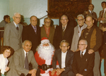 Description :NEUF RETRAITES ENTOURENT LE PERE NOEL, DANS UNE SALLE DE RECEPTION.