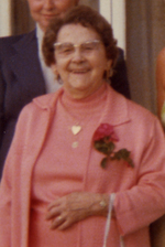 Description :VETU D'UN COSTUME ROSE AVEC FLEUR A LA BOUTONNIERE, MME MACKENZIE SOURIT