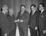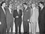 Description :PRENANT LA POSE: DE GAUCHE A DROITE: GILLES COUTURE, GASTON MASSE, CARL CAMIRAND, ECHEVIN, HECTOR FOUQUET, PRESIDENT DU SYNDICAT, GILLES BELISLE, ORGANISATEUR DU BANQUET ET JEAN BOURASSA, INGENIEUR. ILS SEMBLENT RIRE A UNE BLAGUE DE M. CAMIRAN...