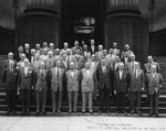 Description :A LA PORTE DU PALAIS DE JUSTICE, LEONIDAS BACHAND EST PHOTOGRAPHIE AVEC SES COLLEGUES LORS D'UNE SESSION DE LA CHAMBRE DES NOTAIRES A MONTREAL. ON RETROUVE LEONIDAS BACHAND A L'EXTREME GAUCHE DE L'AVANT-DERNIERE RANGEE