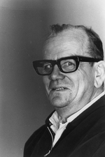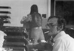 Description :DEVANT SA MACHINE A ECRIRE, CIGARETTE AU BEC, M. GILLES COUTURE EST PRIS SUR LE VIF A SON BUREAU DE TRAVAIL. A L'ARRIERE-PLAN, UNE EMPLOYEE VUE DE DOS. DES CARTABLES DE DOSSIERS SONT EMPILES SUR SON PUPITRE.