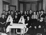 Description :THE-CAUSERIE DONNE SOUS LES AUSPICES DES FILLES D'ISABELLE AU PROFIT DES SOEURS MISSIONNAIRES NOTRE-DAME DES ANGES. SUR LA 1ERE RANGEE, DE GAUCHE A DROITE: MME B. CAYER, SR ST-LUCIEN (LILIANE CAYER) QUI PARTIRA POUR LA CHINE; L'ABBE LEONIDAS A...