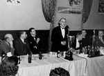 Description :7.1 DERRIERE UNE TABLE OU L'ON VOIT 2 TROPHEES, UBALD ROSE, DE MONTREAL PARLE AU MICRO. A CETTE MEME TABLE DE GAUCHE A DROITE: JOHN S. BOURQUE, DEPUTE DE SHERBROOKE; MAURICE DUPLESSIS, CHEF DE L'UNION NATIONALE; ERNEST COMTE, PRESIDENT DE L'AS...