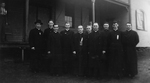 Description :DEVANT LA GALERIE DE LA FERME, DIX RELIGIEUX PRENNENT LA POSE. DE GAUCHE A DROITE: MGR MAURICE VINCENT; ARTHUR GILBERT; ROMEO LAURENCELLE; VICTOR DUPUIS; MGR MICHEL COUTURE; LUCIEN BOULE (?); ANTONIO DUPUIS; LUCIEN GAUTHIER ET LE DERNIER EST I...