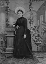 Description :1.1 PHOTO DE STUDIO. ANTOINETTE PINEL EST DEBOUT DANS UNE ROBE DE CREPE NOIR. SES CHEVEUX SONT RETENUS. - 1.2 PHOTO EN BUSTE D'ANTOINETTE PINEL. ELLE PORTE UN RUBAN DE CREPE NOIR, UNE ETOLE DE FOURRURE ET UN COLLIER.