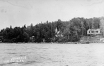 Description :LA BASE PLEIN-AIR JOUVENCE VUE DU LAC AVEC SA CHAPELLE ET QUELQUES PETITS CHALETS ET MAISONNETTES