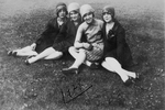 Description :JEUNES FILLES PORTANT CHAPEAU CLOCHE ASSISES SUR UNE PELOUSE. DE GAUCHE A DROITE: CECILE VIDAL, YVETTE PINEL, ANTOINETTE PINEL ET YVETTE VIDAL.