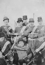 Description :HUIT JOUEURS DU CLUB SONT ASSEMBLES DANS LEUR UNIFORME. ILS PORTENT DES HAUTS-DE-FORME OU DES CHAPEAUX MELON. LEUR CHANDAIL A UNE BANDE PALE PORTANT LES LETTRES V.C.C. L'UN DES JOUEURS TIENT UN FANION OU IL EST ECRIT HOFFMAN.
