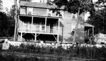 Description :MAISON A DEUX ETAGES, VUE DE L'ARRIERE. LES MURS SONT EN BARDEAUX D'AMIANTE. UNE GALERIE A L'ARRIERE SANS ESCALIER ET UNE SUR LE COTE DROIT. DEUX HOMMES A DROITE ET DERRIERE EUX UN PETIT GARAGE. EN AVANT-PLAN, UN RAIL DE CHEMIN DE FER DESAFFEC...