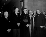 Description :EN AVANT-PLAN, CINQ HOMMES PRENNENT LA POSE. LE PREMIER A GAUCHE EST INCONNU, LE SECOND EST JOHN S. BOURQUE; LE TROISIEME EST LE CARDINAL MAURICE ROY; LE QUATRIEME EST AVILA BEDARD, SOUS-MINISTRE DES TERRES ET FORETS. IL EST LE RECIPIENDAIRE D...