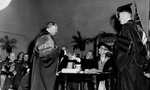 Description :UN HOMME SERRE LA MAIN DU RECTEUR DE L'UNIVERSITE EN RECEVANT SON DIPLOME. ON PEUT APERCEVOIR JOHN S. BOURQUE A L'EXTREME GAUCHE. IL EST ASSIS AVEC D'AUTRES PARTICIPANTS.