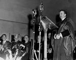 Description :ON APERCOIT A L'AVANT-PLAN A DROITE, MAURICE DUPLESSIS S'ADRESSANT AUX AUDITEURS DES STATIONS DE RADIO CBC ET CJAD SUITE A L'OBTENTION D'UN DOCTORAT HONORIFIQUE DE LA PART DE L'UNIVERSITE LAVAL. ASSIS A DROITE DE LUI ON PEUT ENTREVOIR JOHN S. ...