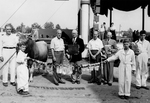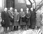 Description :DEVANT LA GRUE SUR LE CHANTIER ON VOIT DE GAUCHE A DROITE: C.B. HOWARD; JOHN S. BOURQUE; ALPHONSE TRUDEAU; D.J. SALLS; ? MUNSTER; RUSSEL BROWN (ST-PETER'S CHURCH) ET MAURICE GINGUES.