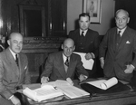 Description :DE GAUCHE A DROITE: LE SECRETAIRE JEAN-MARIE BOURBEAU, AVOCAT ET SOUS-MINISTRE (?); JOHN S. BOURQUE, LE GREFFIER MUNICIPAL ? RIVARD ET LE NOTAIRE CHENIER PICARD SONT AUTOUR D'UNE TABLE POUR LA SIGNATURE DU CONTRAT. EN ARRIERE-PLAN, ON PEUT VOI...
