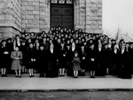 Description :FACE A L'UNE DES ENTREES DU MONT-NOTRE-DAME, UN GROUPE D'ANCIENNES ELEVES PRENNENT LA POSE AVEC QUELQUES SOEURS DE LA CONGREGATION NOTRE-DAME QUI ETAIENT ENSEIGNANTES A L'EPOQUE. 1ERE RANGEE, AU CENTRE, ON APERCOIT DORIMENE BOURQUE PLACEE ENTR...