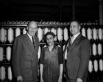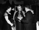 Description :DE GAUCHE A DROITE: DORIMENE BOURQUE; LE CARDINAL PAUL-EMILE LEGER; ET DE DOS, MAURICE DUPLESSIS. MME BOURQUE EST EN ROBE DE SOIREE AVEC ETOLE DE VISON ET MAURICE DUPLESSIS PORTE LE SMOKING.