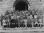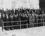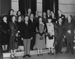 Description :TROIS RANGEES DE NOTABLES DONT DEUX SONT PLACEES SUR DES MARCHES. 1ERE RANGEE, DE GAUCHE A DROITE: YVETTE BOURQUE, EPOUSE DE JOE (FRERE DE JONH S.); DR LASALLE LABERGE, SPECIALISTE DE LA TUBERCULOSE; DORIMENE BOURQUE, EPOUSE DE JOHN S. BOURQUE...