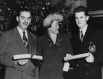 Description :DORIMENE BOURQUE QUI REPRESENTAIT SON EPOUX OFFRE UN CADEAU A IRENEE RIVARD, A GAUCHE SUR LA PHOTO, ET GERMAIN LEDUC, A DROITE SUR LA PHOTO. L'UN PORTE L'INSIGNE DE LA FACULTE DE MEDECINE DE L'UNIVERSITE DE MONTREAL.