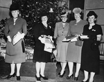 Description :DE GAUCHE A DROITE, DEVANT LE SAPIN DE NOEL: MME STANISLAS FORTIER, PRESIDENTE; MLLE L. TRUDEAU; MME A.-D. BERNIER, INFIRMIERE; DORIMENE BOURQUE ET MME LASALLE LABERGE PRENNENT LA POSE AVEC DES CADEAUX DANS LES MAINS.