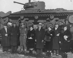 Description :DEVANT UN TANK NOMME "VALENTINE", DE GAUCHE A DROITE: J.-W. GENEST, JOHN S. BOURQUE; LE CAPITAINE P. DROUIN, DU ROYAL 22E, COMMANDANT EN SECOND DU TRAIN-EXPOSITION; MME JOSEPH LABRECQUE; JOSEPH LABRECQUE, MAIRE; MME ALFRED CINQ-MARS; ALFRED CI...