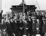 Description :4.1 : PHOTO PRISE SUR LA CORVETTE. A L'ARRIERE, LE CANON DU H.M.C.S. SHERBROOKE. 1ERE RANGEE, DE GAUCHE A DROITE: JOHN S. BOURQUE; ?; PERCY DONAHUE, CHEF DE POLICE ET DES POMPIERS DE SHERBROOKE; B. BELL, SOUS-LIEUTENANT; E. DONALD, LIEUTENANT...