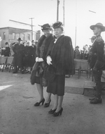 Description :DORIMENE BOURQUE ET LADY FISET, EPOUSE DE SIR EUGENE FISET, LIEUTENANT-GOUVERNEUR DE LA PROVINCE DE QUEBEC, PRENANT LA POSE LORS DU DEVOILEMENT DU CENOTAPHE ERIGE SUR LA PLACE PUBLIQUE. DERRIERE ELLES, DEUX GARDES D'HONNEUR ET ENTRE EUX, LES M...