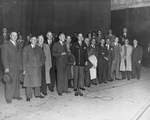 Description :PHOTO DE GROUPE DEVANT L'ENTREE DE LA TOUR DU PARLEMENT A OTTAWA. 1ERE RANGEE, LE 15E A PARTIR DE LA GAUCHE, ON APERCOIT LE PREMIER MINISTRE MACKENZIE KING, A SA DROITE GEORGE DREW, PREMIER MINISTRE DE L'ONTARIO ET A SA GAUCHE, LE PREMIER MINI...