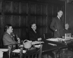 Description :NOUS VOYONS A UNE TABLE, QUATRE PERSONNES ET DERRIERE ELLES UN PANNEAU EN BOISERIE. JOHN S. BOURQUE DEBOUT, ATTEND PROBABLEMENT UNE QUESTION DES CONGRESSISTES. DE GAUCHE A DROITE: RENE GOBEIL, INGENIEUR FORESTIER ET GERANT DE L'ASSOCIATION FOR...