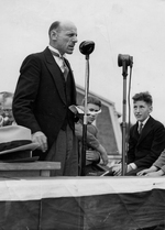 Description :ON VOIT JOHN S. BOURQUE DEBOUT SUR L'ESTRADE DEVANT DEUX MICROS. A SES COTES, NOUS VOYONS DE JEUNES GARCONS QUI ECOUTENT LE DISCOURS.