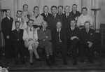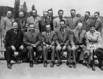 Description :ASSIS SUR UN BANC, DE GAUCHE A DROITE: SYLVIO ROUSSEAU; ALPHONSE TRUDEAU, MAIRE; ?; CARLO FABI, PROPRIETAIRE ET FONDATEUR DES AMBULANCES DE L'ESTRIE; JOHN S. BOURQUE, MINISTRE; ?. 2E RANGEE: PAUL HAMEL; CARL CAMIRAND; ?; YVON SIROIS; VALMORE C...