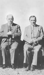 Description :A GAUCHE, ON VOIT MACKENZIE KING ASSIS LES MAINS APPUYEES SUR UNE CANNE. A DROITE, MAURICE L. DUPLESSIS.
