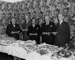 Description :DE GAUCHE A DROITE: J.A PARROT, ARPENTEUR-GEOMETRE; JOHN S. BOURQUE; ALPHONSE BELANGER, ARCHITECTE; CHARLES BENJAMIN HOWARD; LE SENATEUR JACOB NICOL. ILS SONT DEBOUT DEVANT UNE TABLE REMPLIE DE NOURRITURE. DERRIERE EUX DE MAGNIFIQUES TENTURES ...