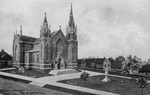Description :EXTERIEUR DE L'EGLISE. ON VOIT LE TERRAIN A L'AVANT OU L'ON RETROUVE LE MONUMENT AU SACRE-COEUR. ON APERCOIT QUELQUES MAISONS SUR LE COTE DROIT.