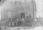 Description :VUE SUR L'EXTERIEUR D'UNE PETITE ECOLE DE VILLAGE EN BOIS. SUR LE BALCON, LES ELEVES SE TIENNENT DEBOUT.