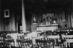 Description :INTERIEUR DE LA CHAPELLE DE STORNOWAY. ON VOIT L'AUTEL ET QUELQUES CHAISES QUI TIENNENT LIEU DE BANC.