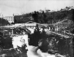 Description :VUE SUR LA RECONSTRUCTION DU PONT. LA PREMIERE MAISON A GAUCHE, APRES LE PONT, EST CELLE DE HUBERT-C. CABANA, PREMIER MAIRE CANADIEN-FRANCAIS DE SHERBROOKE (1880-85)