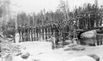 Description :DES DRAVEURS DEBOUT SUR DES BILLOTS, FLOTTENT SUR UNE RIVIERE A WOBURN. ILS TIENNENT DANS LEURS MAINS UN PEAVY QUI SERT A REMUER LES BILLOTS DE BOIS. A L'AVANT, UN DES LEURS TIENT UNE GAFFE EN POSITION HORIZONTALE.