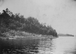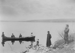 Description :UN HOMME ET TROIS FEMMES FONT UNE EXCURSION SUR LE LAC MEGANTIC. SUR LE RIVAGE, ON REMARQUE L'ABBE SIMARD EN COMPAGNIE DU PERE RIOUX.