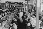 Description :INVITES D'UN BANQUET A L'OCCASION DE LA BENEDICTION DE L'EGLISE A ST-CAMILLE DE WOLFE. LA SALLE PAROISSIALE EST DECOREE ET ON VOIT QUELQUES TABLES.