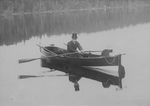 Description :L'ABBE J.E.CHOQUETTE EN CHALOUPE, PROBABLEMENT AU LAC MEGANTIC.