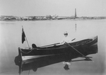 Description :HELENE CHOQUETTE SUR UNE EMBARCATION RESSEMBLANT A UNE CHALOUPE. LE DRAPEAU BRITANNIQUE FLOTTE SUR L'EMBARCATION. A L'ARRIERE-SCENE ON APERCOIT UN REGROUPEMENT DE MAISONS. IL S'AGIT PROBABLEMENT DU VILLAGE DE LAC MEGANTIC.