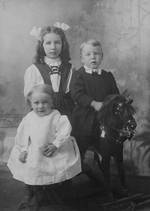 Description :TROIS ENFANTS PHOTOGRAPHIES. LE PETIT GARCON EST ASSIS SUR UN CHEVAL DE BOIS.