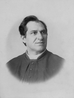 Description :PORTRAIT DU PERE DURAND. IL EST ASSIS ET PORTE UNE CROIX AU COU.