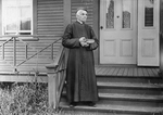 Description :ON VOIT L'ABBE FRANCOEUR DEBOUT DANS L'ESCALIER DU PRESBYTERE (?). IL TIENT UN LIVRE A LA MAIN. ON NE VOIT QUE TRES PEU LA MAISON.