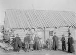 Description :A L'AVANT D'UN GENRE DE HANGAR, ON APERCOIT LA FAMILLE CAMPAGNA EN COMPAGNIE DE TROIS MEMBRES DU CLERGE DONT MGR LAROCQUE