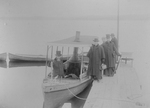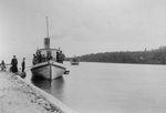 Description :LE MACANNAMAC EST ATTACHE AU QUAI. MGR LAROCQUE EST DEJA SUR LE BATEAU. ENCORE SUR LE QUAI, ON REMARQUE MGR CHALIFOUX ET LE CURE J.E.CHOQUETTE.